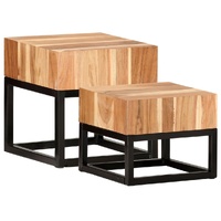 Bring a touch of rustic charm into your home decor with our distinctive and stylish side tables! Consisting of 2 wooden side tables in different sizes, this table set will definitely make a great addition to your home decor. The solid tabletop provides a stable and secure surface on which you can place drinks, a fruit basket or vase or other decorative items. The strong steel legs add to the robust construction. The table set is handmade of solid acacia wood. The fine craftsmanship and the beautiful wood grains make every piece of furniture unique and slightly different from the next. Additionally, these tables can also be used as coffee tables, couch tables, living room tables, nightstands, etc. Important note: Delivery includes 2 side tables.