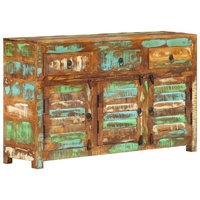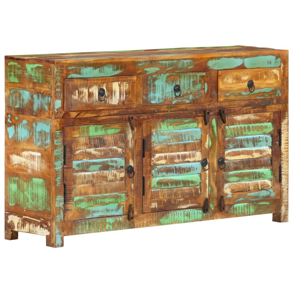 This sideboard will be a perfect choice if you are looking to add a touch of rustic charm to your home decor. This storage cabinet is handmade from solid reclaimed wood, a combination of reclaimed timbers including teak, mango wood, pinewood, beech, etc. These woods are recycled from old buildings such as factories, sheds and boats. This makes it a fantastic environmentally friendly option in furniture making. As every piece is handmade, colours vary with many blues, greens, creams and sometimes oranges, reds and pinks shades revealed. This even means each one is unique! The sturdy top is ideal for displaying photo frames, vases, fruit baskets, or other decorative items. Additionally, 3 drawers and 3 doors provide ample storage space, which will keep your items dust free and clutter out of sight. Important note: The colour may vary from piece to piece, making each of our sideboards unique. The delivery is random, ensuring the exclusivity and individuality of your product.