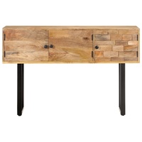 This wooden sideboard adds an industrial look to your home decor. The side cabinet is made of solid mango wood with natural timber fine finish, a tropical hardwood with the strength to bear the weight. It also stands the wear and tear of time, making it stable and durable. The craftsmanship and the beautiful wood grains make every piece of furniture unique and slightly different from the next. It has two compartments behind three doors to provide ample storage space. Additionally, the sturdy top is ideal for displaying decorative objects such as photo frames, potted plants, vases, etc. Important note: Colours and grains may vary from piece to piece, making each piece unique. The delivery is random, ensuring the exclusivity and individuality of your product.