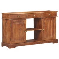 This wooden sideboard gives your home decor a touch of rustic charm with its timeless design. The side cabinet is made of solid acacia wood with a honey brown finish, making it sturdy and durable. Solid acacia wood is a tropical hardwood, which has beautiful grains and gives the furniture a touch of natural style. Every step of the process is carried out with the greatest care, be it polishing, painting, or lacquering. The cabinet has 2 doors, 2 compartments, and 3 drawers, providing ample storage space for your books and personal belongings. The sturdy tabletop is ideal for displaying decorative objects, photo frames, and other items. Additionally, it is also easy to clean with a damp cloth. Important note: Colours and grains vary from piece to piece, making each piece unique. The delivery is random, ensuring the exclusivity and individuality of your product.