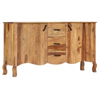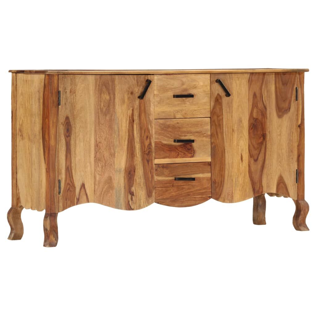 This sideboard radiates a distinctive charm that will add an eye-catching piece to your home decor. The cabinet is made of solid wood, which is durable and beautiful. Additionally, it doesn't warp or split, and has natural decay resistance. As a consequence, this beautifully-designed sideboard is exceedingly stable, durable and attention-grabbing. The perfect craftsmanship guarantees that every step of the process is carried out with the greatest care, be it polishing or lacquering. Our wooden cabinet is fully handmade and the aesthetically-appealing wood grains make every piece distinctive and slightly different from each other. This sideboard features 3 drawers and 2 doors, providing ample space for storing your multimedia appliances, books, as well as various other items. This item is already assembled; no assembly is required. Important note: The wood grains vary from piece to piece, making each piece unique. The delivery is random, ensuring the exclusivity and individuality of your product.