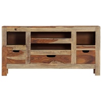 Introduce an air of rustic charm into your home interior with our stylish solid Sheesham wood sideboard! The cabinet is made of solid Sheesham wood, a tropical hardwood that is famous for its natural grains and smooth texture, which is also known as rosewood or palisander. Moreover, it doesn't warp or split, and has natural decay resistance. As a consequence, this beautifully-designed TV stand is exceedingly stable, durable, as well as attention-grabbing. The exquisite craftsmanship guarantees that every step of the process is carried out with the greatest care, be it polishing or lacquering. Our wooden cabinet is fully handmade and the aesthetically-appealing wood grains make every piece distinctive and slightly different from each other. Additionally, this sideboard features 3 drawers and 4 open compartments, providing ample space for storing your multimedia appliance, books as well as various other items. Important note: The wood grains vary from piece to piece, making each piece unique. The delivery is random, ensuring the exclusivity and individuality of your product.