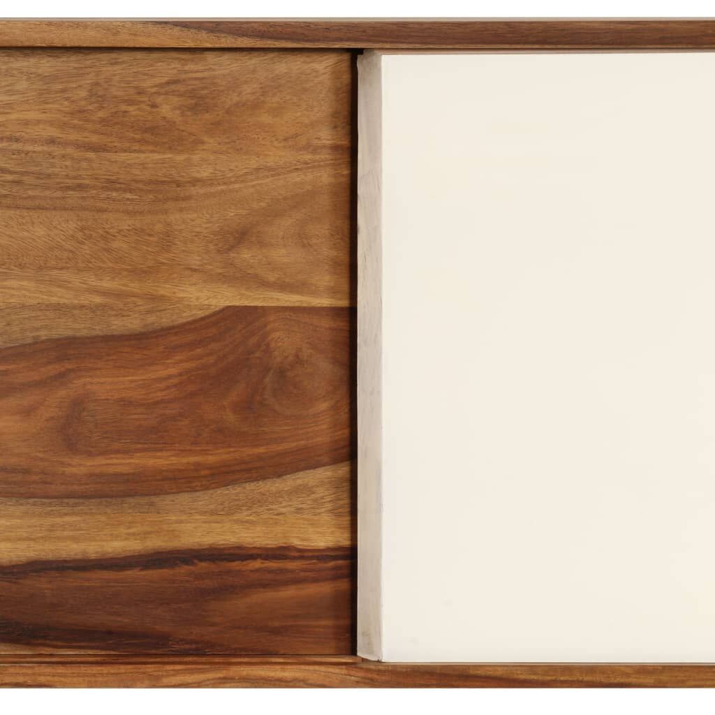 This solid Sheesham wood sideboard, featuring an elegant design, will be a focal point of any room. This wooden sideboard has a sturdy top, on which you can place decorative items like fruit baskets or vases. Its large compartments with sliding doors provide an ideal solution for keeping your items organised and clutter out of sight. Crafted from solid Sheesham wood, the side cabinet is durable and easy to maintain. Sheesham is a tropical hardwood that is famous for its rich grains and also known as rosewood or palisander. Its beautiful wood grains make every piece of furniture unique and slightly different from the next. The strong wooden legs contribute to the sturdy construction. Our sideboard is easy to assemble. Important note: Colours vary from piece to piece, making each piece unique. The delivery is random, ensuring the exclusivity and individuality of your product.
