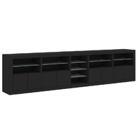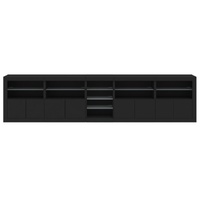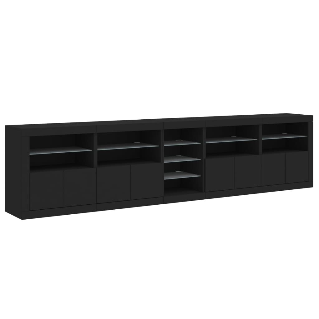Decorate your room with this modern sideboard with LED lights, it easily blends with furniture in any style at your house. Durable material: The engineered wood is of exceptional quality with smooth surface and also features strength, stability and resistance to moisture.RGB LED lights: The buffet is equipped with vibrant RGB LED lights. With various customisable menus, you can effortlessly change the colour of the lights and even set them to adjust automatically. These LED lights not only enhance the contemporary look of the sideboard cabinet but also add to its trendy appeal.Ample storage space: The storage cabinet offers plenty of space to keep your everyday items neatly arranged and easily accessible.Displaying function: The sturdy top of the hallway cabinet is ideal for displaying decorative objects, photo frames, or potted plants.Practical doors: Keep your essentials free from dust by hiding them behind the doors of the side cabinet. Good to know:The product has a USB connector that requires a certified 5V USB power source (not included). Warning:To prevent it being overturned, this product must be used with the provided wall attachment device.