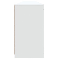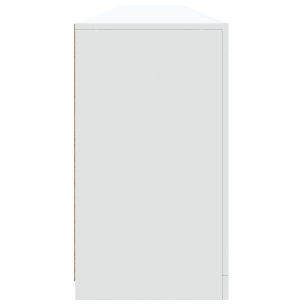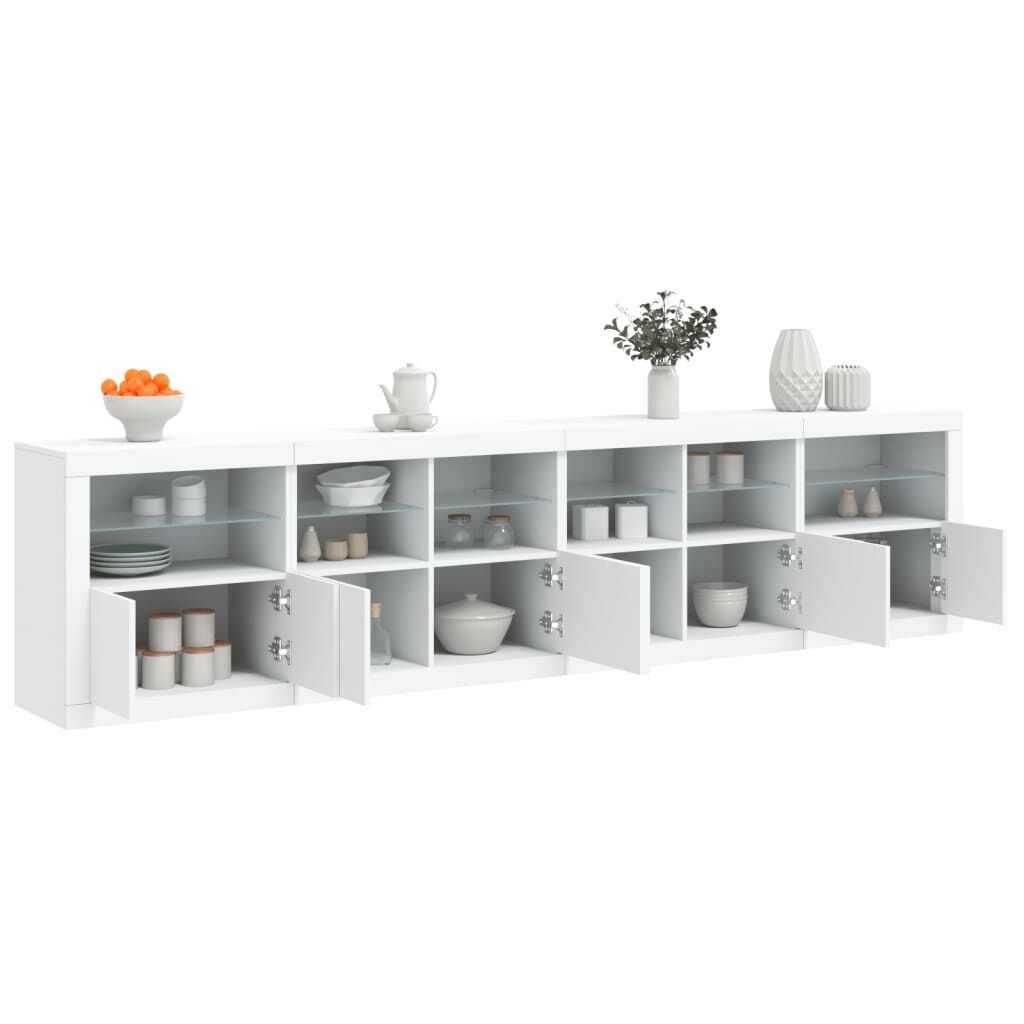 Decorate your room with this modern sideboard with LED lights, it easily blends with furniture in any style at your house. Durable material: The engineered wood is of exceptional quality with smooth surface and also features strength, stability and resistance to moisture.RGB LED lights: The buffet is equipped with vibrant RGB LED lights. With various customisable menus, you can effortlessly change the colour of the lights and even set them to adjust automatically. These LED lights not only enhance the contemporary look of the sideboard cabinet but also add to its trendy appeal.Ample storage space: The storage cabinet offers plenty of space to keep your everyday items neatly arranged and easily accessible.Displaying function: The sturdy top of the hallway cabinet is ideal for displaying decorative objects, photo frames, or potted plants.Practical doors: Keep your essentials free from dust by hiding them behind the doors of the side cabinet. Good to know:The product has a USB connector that requires a certified 5V USB power source (not included). Warning:To prevent it being overturned, this product must be used with the provided wall attachment device.