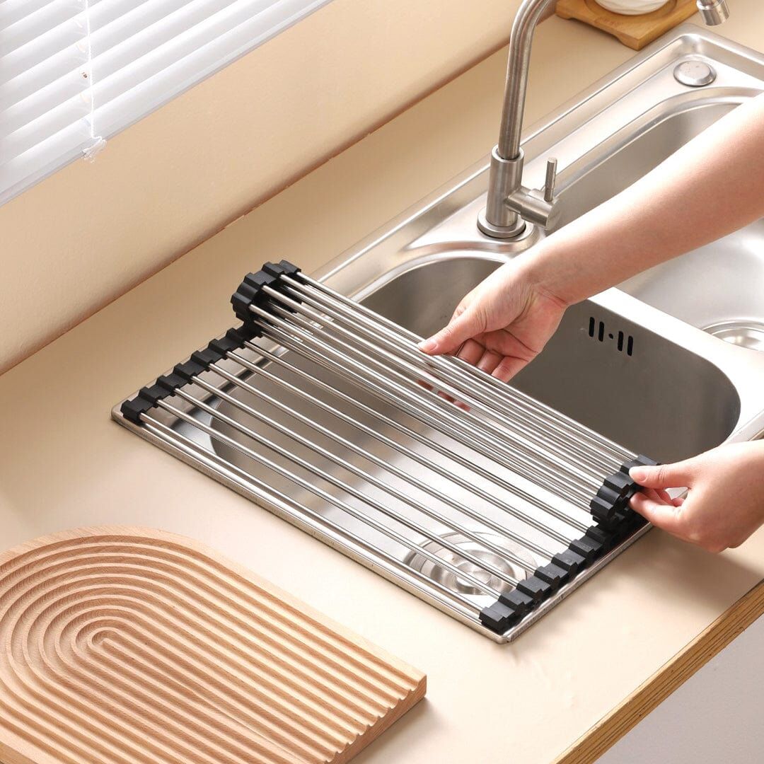 18pcs Stainless Still Pipes. Suitable for most kitchen sinks and counter. One of the great kitchen gadgets for a tidy kitchen and cozy home. A great addition to kitchen accessories and apartment necessities. Please measure your sink size before purchasing this roll up dish drying rack over sink!