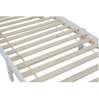 Made of natural pine wood, our bed frame is ideal for your kids as it for any adult. Strong and sturdy, the bed frame comes with a solid timber slated base, stylish headboard, heavy duty steel fixings and smooth edges all round. Finished in a non-toxic, eco-friendly white paint, the neutral coloured bed frame makes for easy décor coordination with any bedroom.