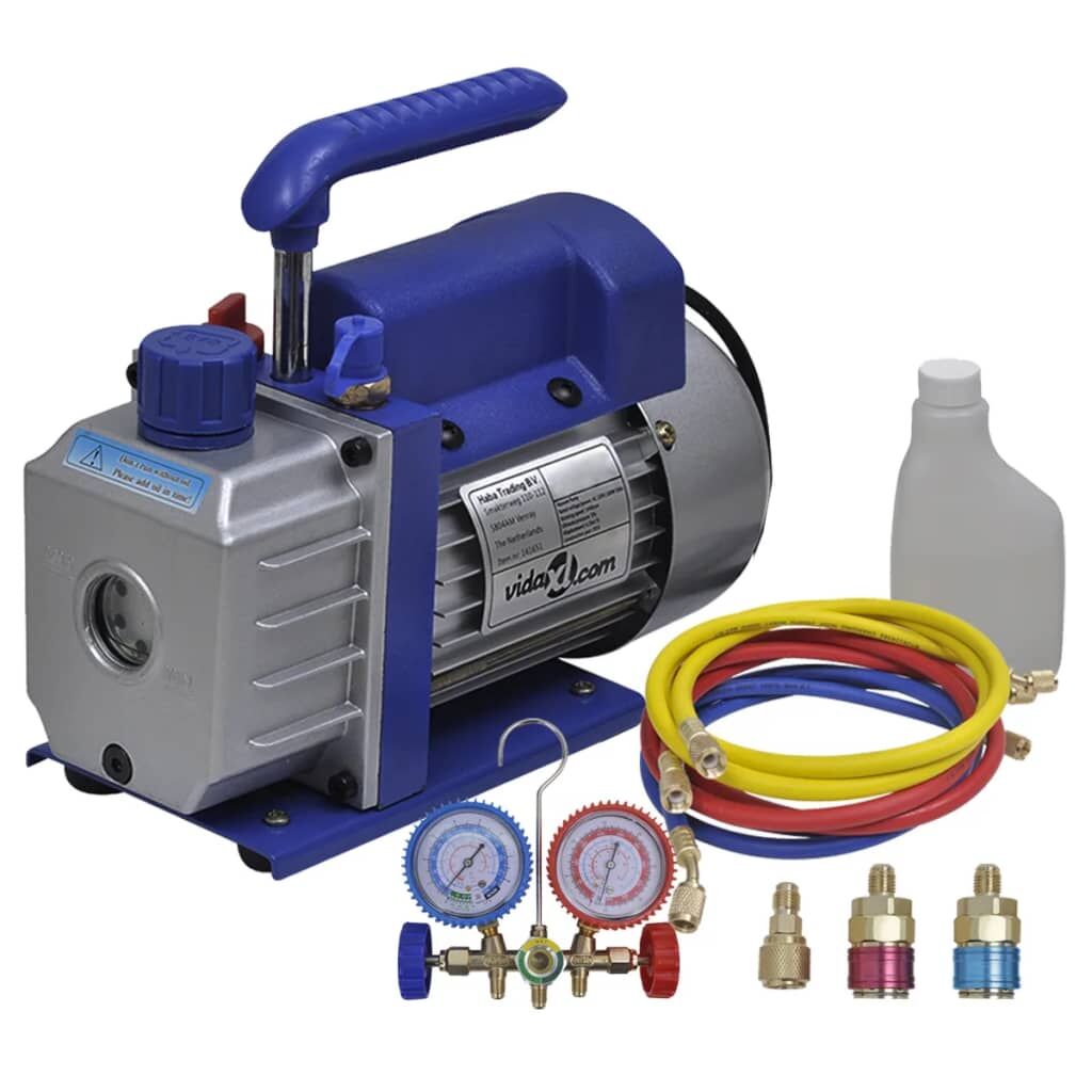 This complete refrigerant tool kit includes the vacuum pump and the 2-way manifold gauge set. This vacuum pump is designed for professional use in refrigeration and air conditioning systems. The pump creates a vacuum, which makes the subsequent filling of the air conditioning system with refrigerant possible. Thanks to its technical characteristics, the pump is suitable for refrigeration repair, printing machinery, medical appliances, vacuum packaging, hot forming and other extraction operations. The pump features an aluminium housing and a practical oil sight glass, which allows you to check the oil level at any time. It also has an integrated handle for easy transport. This 2-way manifold gauge set is suitable for filling and inspecting air conditioning systems by providing system pressure readings. It is suitable for use on all car A/Cs, as well as commercial and domestic A/C refrigeration systems. The colour-coded gauges are quick, clear and easy to read. The gauges are encased in a protective bumper to prevent damage. You can use the integrated steel hook to quickly and easily suspend the gauges. The manifold gauge set has a durable construction.