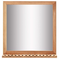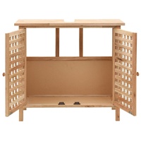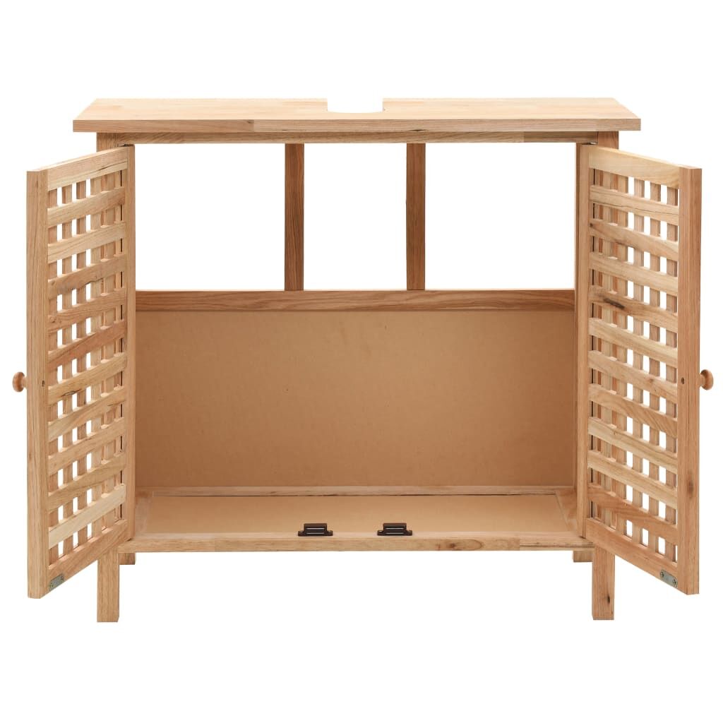 Our wooden sink cabinet with mirror has an attractive natural style and will be an eye-catcher in your bathroom. Made of solid walnut wood and plywood, this sink cabinet and mirror set is sturdy and durable. The bathroom cabinet has two doors with a lattice design, which allows for good ventilation of the items inside. The large compartment and shelf inside the cabinet provide ample storage space for things like towels and hygiene products. The mirror features a solid slatted shelf for placing smaller objects like toothbrushes, cosmetics, etc.