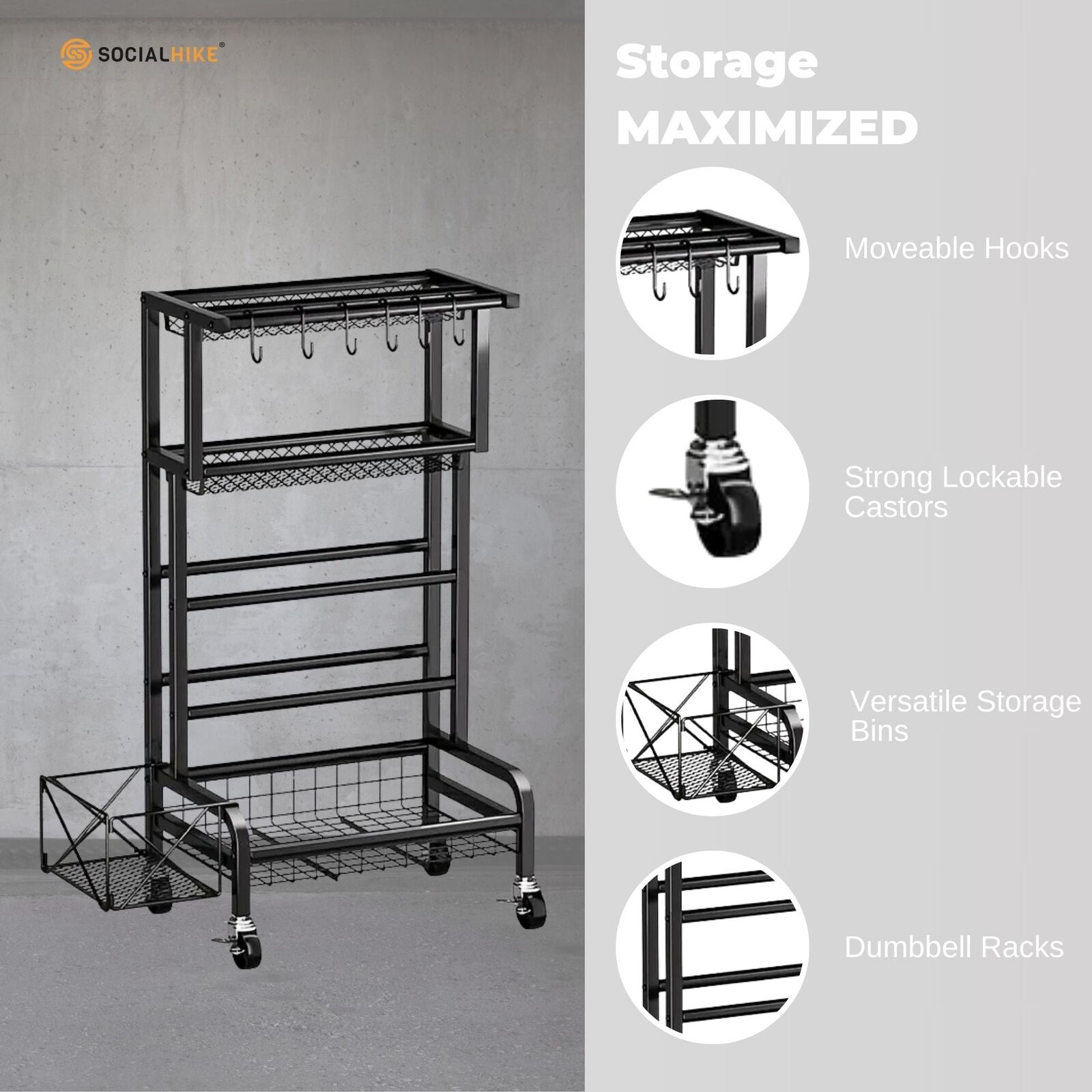 The Social Hike Gym Grade Storage Rack on Wheels is your all-in-one solution for keeping home or studio workouts tidy and efficient. With multiple shelves, hanging hooks, and side compartments, it stores everything from dumbbells and mats to resistance bands and foam rollers. The sturdy steel frame and lockable wheels make it both strong and mobile—perfect for any fitness setup.