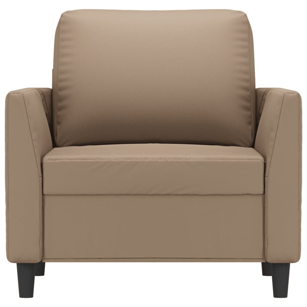 This sofa chair is an excellent place for chatting, reading, watching TV or just relaxing. It is meant to be a focal point in your home. Durable faux leather: Premium faux leather is a highly durable material. It is resistant to stain, making it easy to clean with a damp cloth. The smooth surface also gives a luxurious look and the beauty of real leather.Sturdy and stable frame: The metal frame of the sofa chair ensures sturdiness and stability.Comfortable seat experience: The armchair is highly comfortable with the thickly padded seat, armrests and back pillow.Eye-catching design: Featuring a simple yet modern design, this sofa is meant to be an eye-catcher in your room.