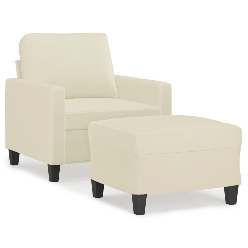This sofa chair with footstool is an excellent place for chatting, reading, watching TV or just relaxing. It is meant to be a focal point in your home. Durable faux leather: Premium faux leather is a highly durable material. It is resistant to stain, making it easy to clean with a damp cloth. The smooth surface also gives a luxurious look and the beauty of real leather.Sturdy and stable frame: The plywood and metal frame of the sofa with footstool ensures sturdiness and stability.Comfortable seat experience: The armchair is highly comfortable with the thickly padded seat, armrests and back pillow.Versatile footstool: The stool is suitable for resting your feet when you lie on a sofa or recliner, or offering you an additional seat in your room. Additionally, the simple design and compact size make it ideal for almost all your living spaces.Eye-catching design: Featuring a simple yet modern design, this sofa with footstool is meant to be an eye-catcher in your room.