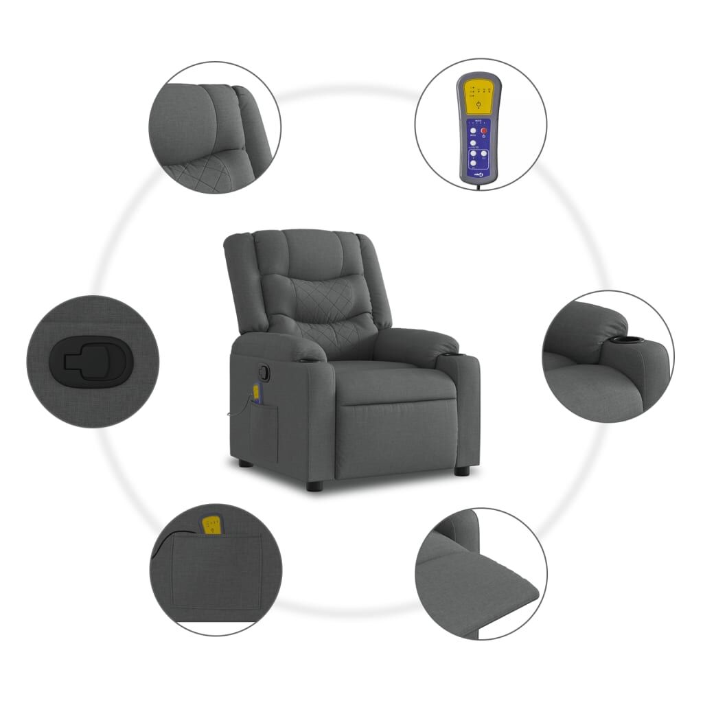 Sit back and drift away in this highly comfortable stand up massage recliner chair! Power lift function: This recliner chair for the elderly is equipped with an electric motor for the lifting-up function. Thanks to the function that pushes the entire chair up, you can easily stand without stressing your back and knees with a simple press of the button.Manual reclining function: This reclining chair has a handle on the right side. You can manually adjust the footrest and the backrest to any position as per your comfort with a simple pull of the handle. This feature allows for a maximum tilt of 135 degrees. Additionally, the backrest can go quickly back to the original place with an easy pull of the handle.Vibration function: The featured 6 massage points let you experience a better-targeted massage. Additionally, the included hand control allows you to pick different massage programs. The massage function is powered by the USB connector that requires a certified 5V USB power source (not included).Comfortable seat experience: The thickly padded seat, backrest, and wide armrests covered in fabric provide a cosy and warm sensation, making you feel embraced while seated. The fabric features a simple and clean look and is breathable and durable.Convenient cup holders and side pocket: This armchair has two convenient cup holders for your drinks and a side pocket for your remote control or keeping your essential items within easy reach.Solid and stable frame: The frame made of wood and metal provides a strong structure and stability. This reclining armchair is comfortable and durable.