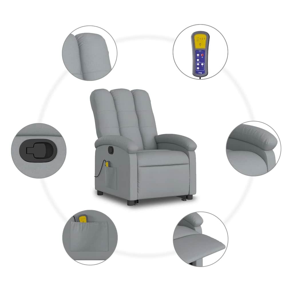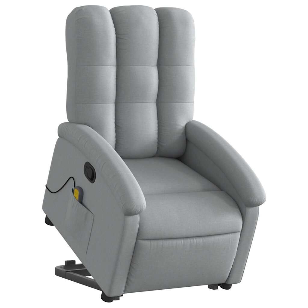Sit back and drift away in this highly comfortable stand up massage recliner chair! Power lift function: This recliner chair for the elderly is equipped with an electric motor for the lifting-up function. Thanks to the function that pushes the entire chair up, you can easily stand without stressing your back and knees with a simple press of the button. Manual reclining function: This reclining chair has a handle on the right side. You can manually adjust the footrest and the backrest to any position as per your comfort with a simple pull of the handle. This feature allows for a maximum tilt of 135 degrees. Additionally, the backrest can go quickly back to the original place with an easy pull of the handle. Vibration function: The featured 6 massage points let you experience a better-targeted massage. Additionally, the included hand control allows you to pick different massage programs. The massage function is powered by the USB connector that requires a certified 5V USB power source (not included). Comfortable seat experience: The thickly padded seat, backrest, and wide armrests covered in fabric provide a cosy and warm sensation, making you feel embraced while seated. The fabric features a simple and clean look and is breathable and durable. Convenient side pocket: This armchair has a side pocket for your remote control or keeping your essential items within easy reach. Solid and stable frame: The frame made of wood and metal provides a strong structure and stability. This reclining armchair is comfortable and durable.