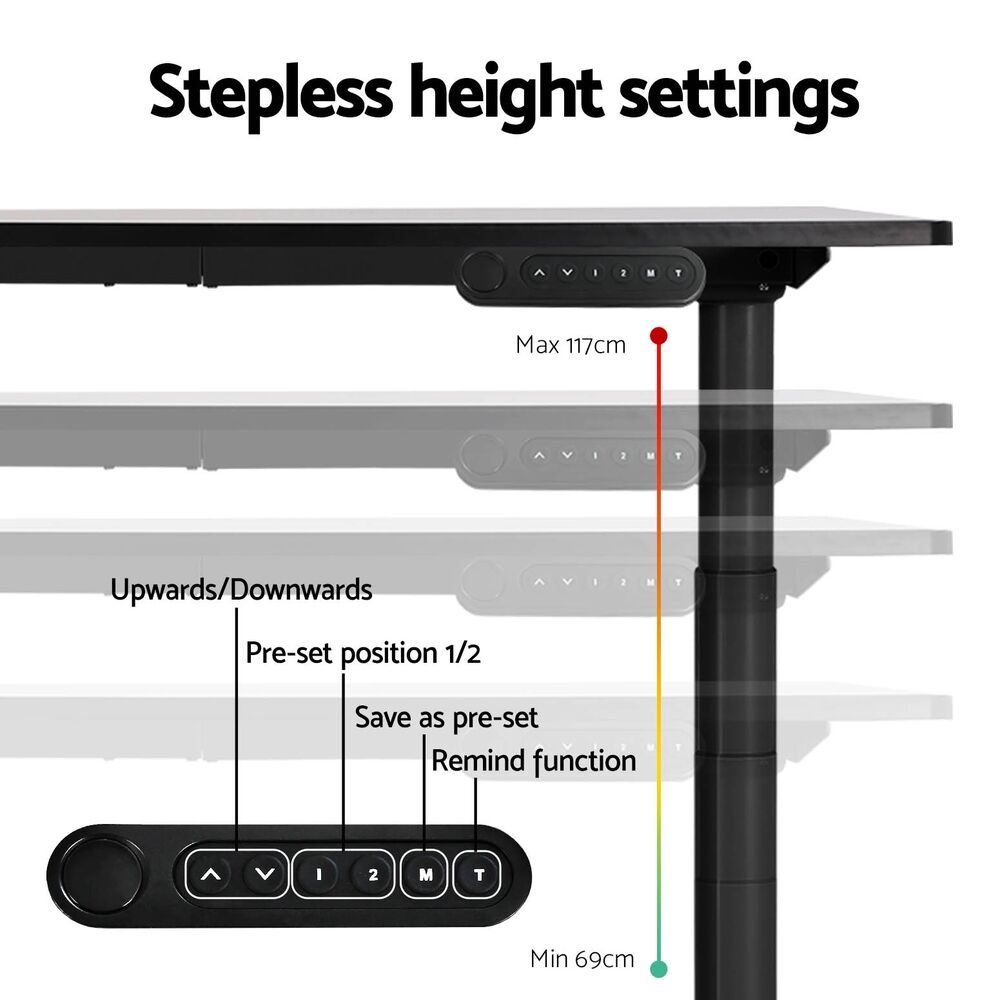 $315.83Poor posture and sedentary lifestyles contribute to several health issues. Now keep your health in good shape with Artiss motorised sit and stand desk frame! Its designed to go with our Artiss desktop and wont disappoint you either with its quality or aestheticsWith our innovative height-adjustable desk frame, you can stand while working and stretch and engage your muscles to prevent them from weakening. Our high-quality powder-coated desk frame makes cleaning and maintenance easy and ensures ultimate sturdiness. It features an easy-to-use digital control panel that enables you to easily adjust the desk to a suitable height and ensure your comfort while working. The smooth motors allow for ultra-quiet operation with low energy consumption. It also comes with adjustable rubber foot pads that offer extra stability and keep your floors safe. As for the desktop, it comes with pre-drilled holes for easy installation. It is made from eco-friendly particleboard and comes with a natural wood grain or contemporary matte finish to create a smooth surface and a beautiful aesthetic. The desktop is scratch resistant and perfect for all your working needs. Get yourself Artiss Motorised Adjustable Desk Frame and Desktop to prevent fatigue and improve productivity.