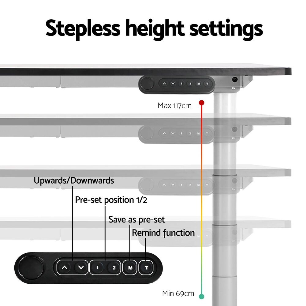 $306.43Poor posture and sedentary lifestyles contribute to several health issues. Now keep your health in good shape with Artiss motorised sit and stand desk frame! Its designed to go with our Artiss desktop and wont disappoint you either with its quality or aestheticsWith our innovative height-adjustable desk frame, you can stand while working and stretch and engage your muscles to prevent them from weakening. Our high-quality powder-coated desk frame makes cleaning and maintenance easy and ensures ultimate sturdiness. It features an easy-to-use digital control panel that enables you to easily adjust the desk to a suitable height and ensure your comfort while working. The smooth motors allow for ultra-quiet operation with low energy consumption. It also comes with adjustable rubber foot pads that offer extra stability and keep your floors safe. As for the desktop, it comes with pre-drilled holes for easy installation. It is made from eco-friendly particleboard and comes with a natural wood grain or contemporary matte finish to create a smooth surface and a beautiful aesthetic. The desktop is scratch resistant and perfect for all your working needs. Get yourself Artiss Motorised Adjustable Desk Frame and Desktop to prevent fatigue and improve productivity.