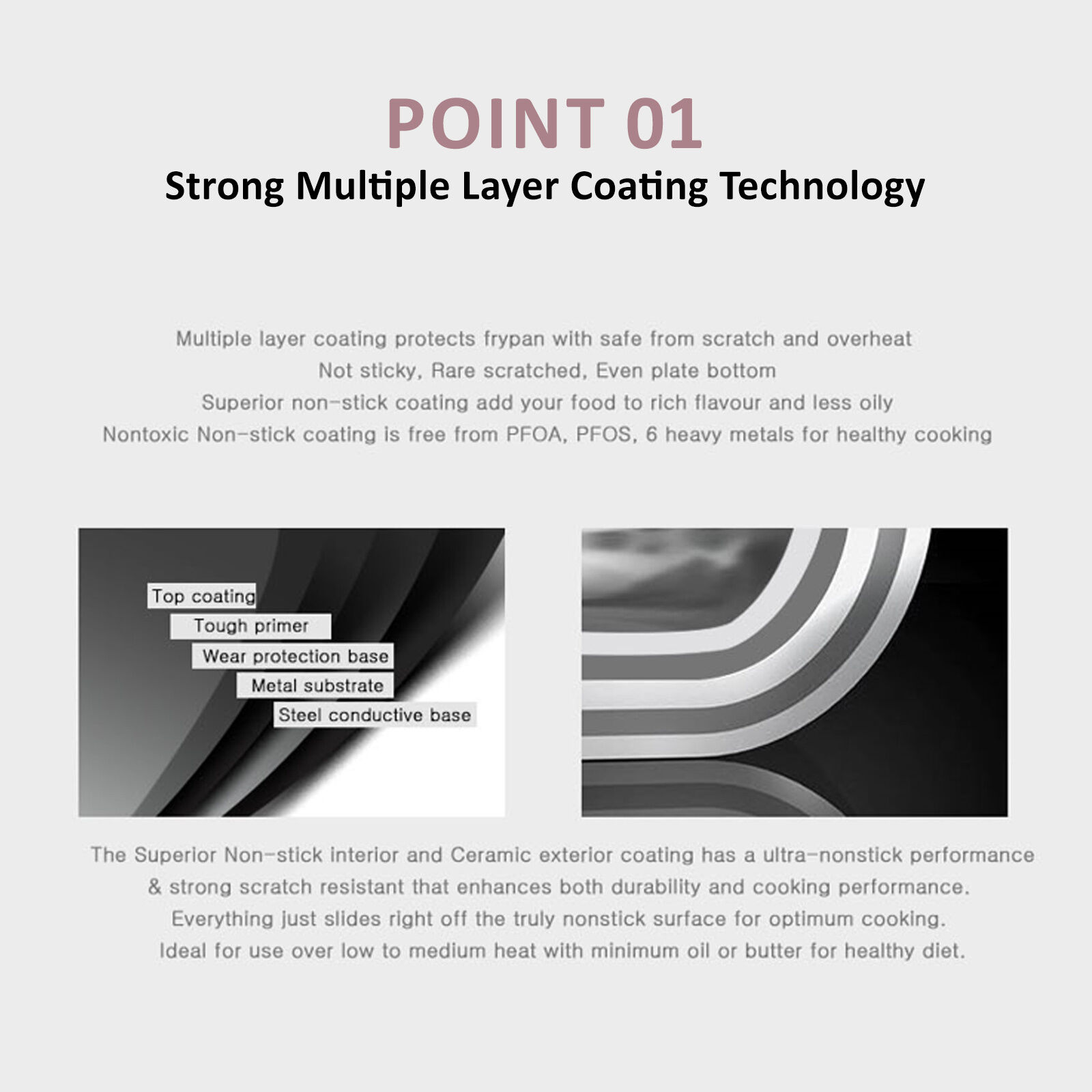 NON-TOXIC AND INDUCTION COMPATIBLE - Nontoxic eco-friendly ceramic coating that is PFOA free for healthy cooking. The frying pan is made with a flat bottom which allows it to be placed evenly over the heat source and is suitable for use on most stovetops including induction, gas, halogen, ceramic glass, etc; Dishwasher safe.