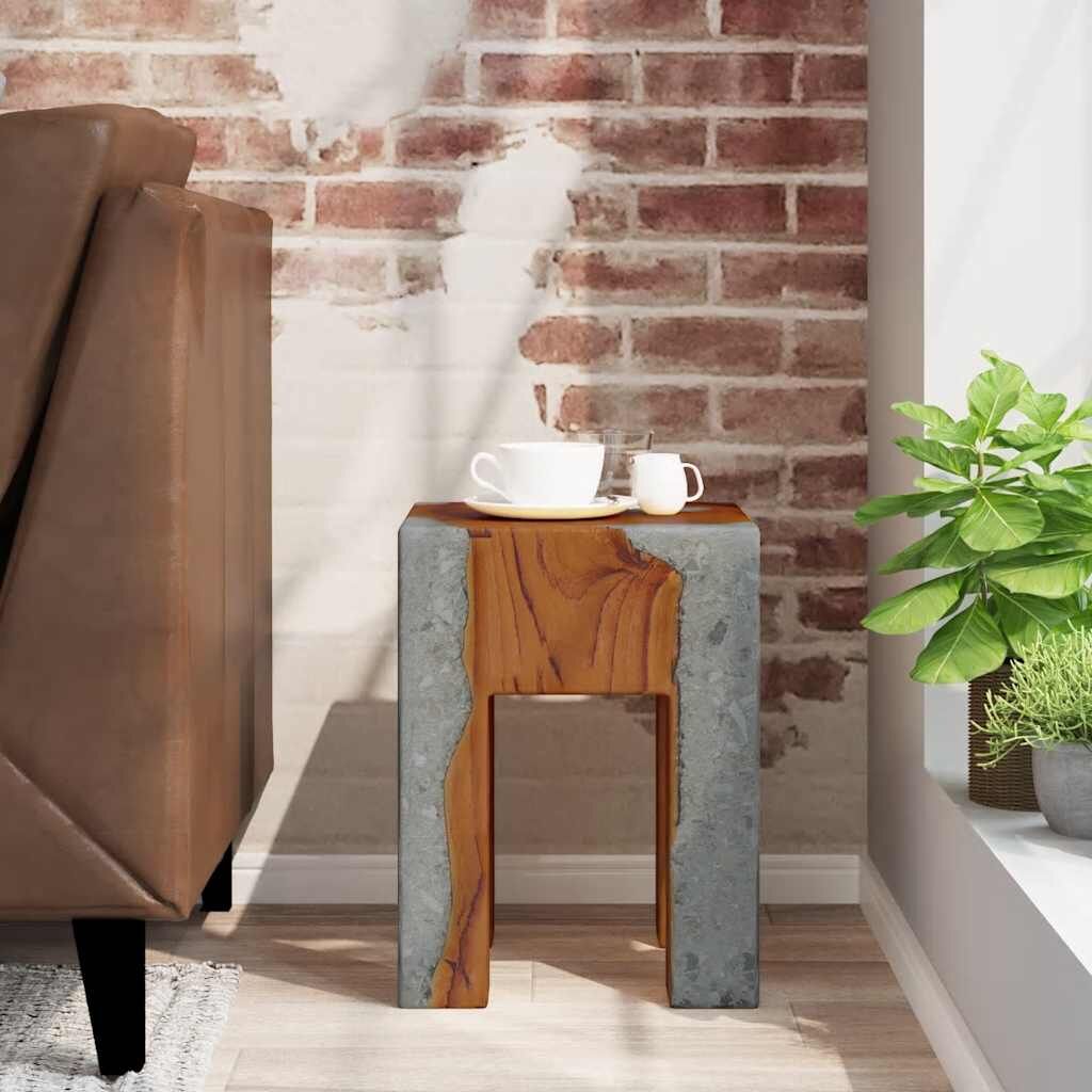 This unique wooden stool, made of solid teak with a transparent resin decoration, exudes a rustic charm and is a real eye-catcher. The stool can also be used as a footrest, side table, etc. The stool is fully handmade and the craftsmanship adds to its luxurious appearance. It also features four stable legs. Important note: As wood is a natural product, the colours and grain patterns vary from piece to piece, making each of our stools unique and different from the next. The delivery is random, ensuring the exclusivity and individuality of your product.