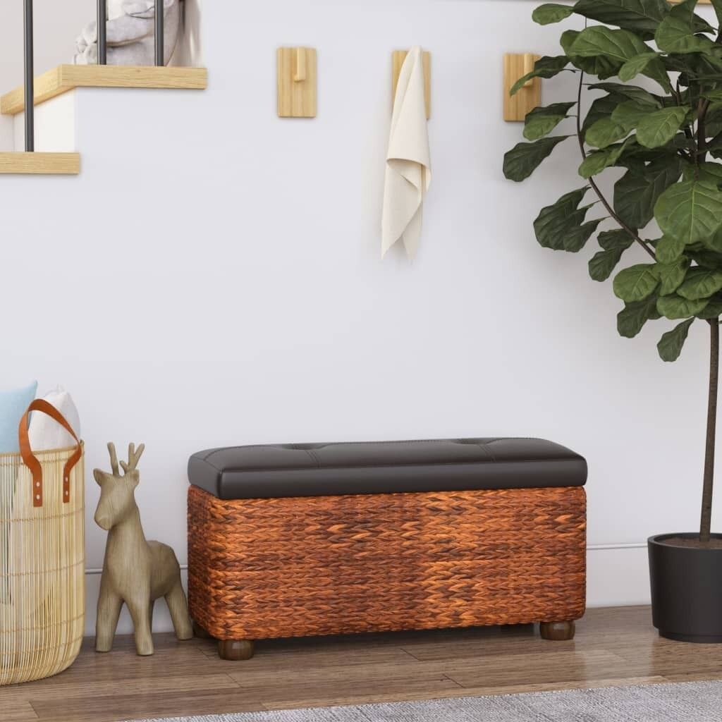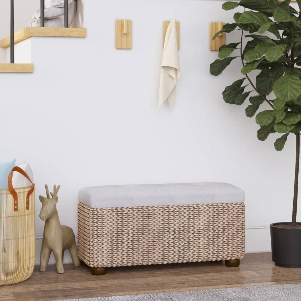 $160.73These storage benches in an attractive natural style make an elegant as well as practical addition to your hallway, living room or bedroom. Durable cattail: Cattail is a durable woven material with a natural finish that retains the traces and irregularities of the material itself, adding a decorative touch to the furniture.Stable plywood: The bench's frame is made of plywood. Plywood is a stable and impact-resistant material. It has an even texture without fibres showing and is resistant to warping and splitting.Ample storage space: The hall box bench has a large storage compartment underneath the cushion for storing your cushions, pillows, blankets, toys, and other items.Comfortable seating: This thickly-padded upholstery of the hall storage provides you with optimum comfort.