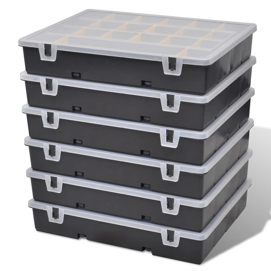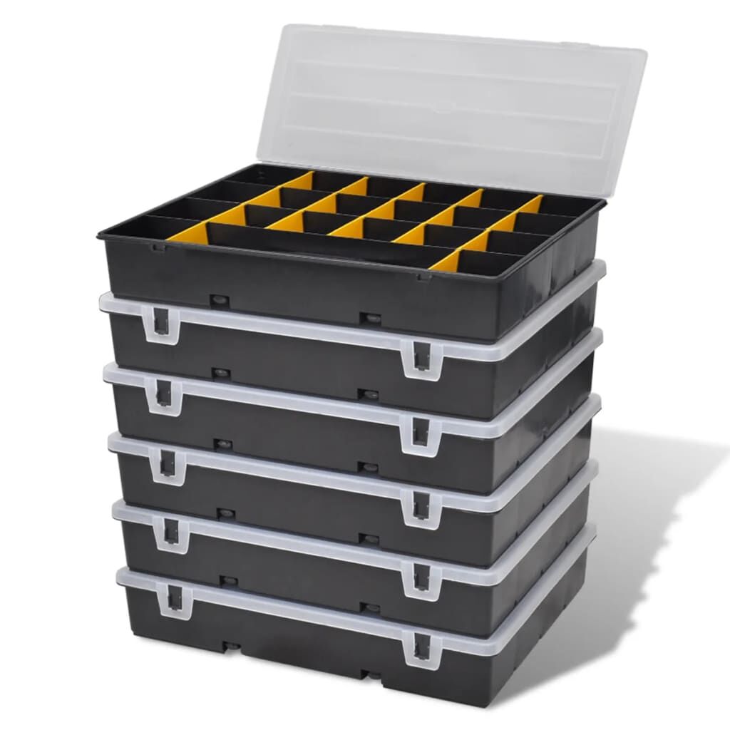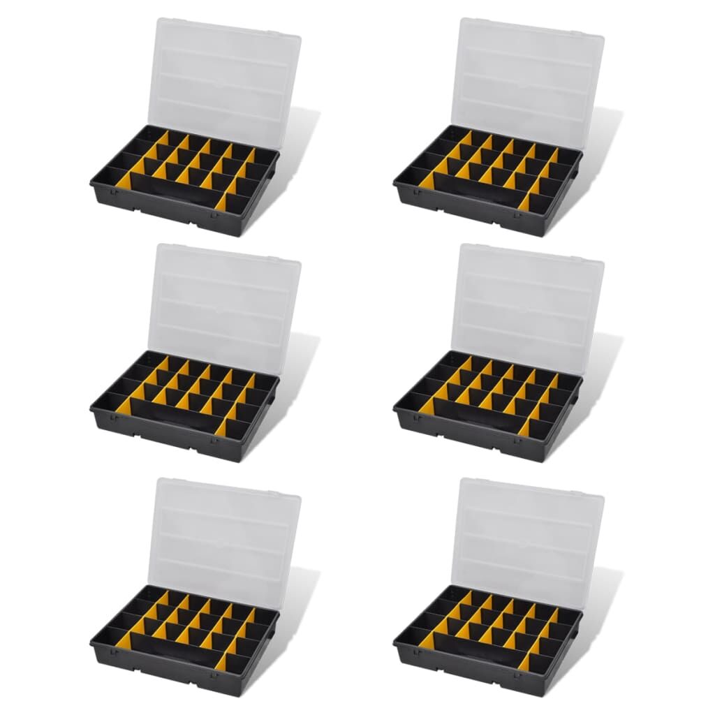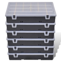 This robust plastic tool box set, including 6 pcs, is ideal for storing such tools as nuts, bolts, screws, and other small parts. Each tool box features 21 compartments, which will surely help you to maintain your small tools in great order and thus bring convenience of future use. Made of quality polypropylene, the box has high thermal stability, corrosion resistance and is very durable for years of use. Thanks to the included handle, the tool box is portable. Our tool box set is surely a great helper to organize your tools. Delivery includes 6 pcs of tool boxes.