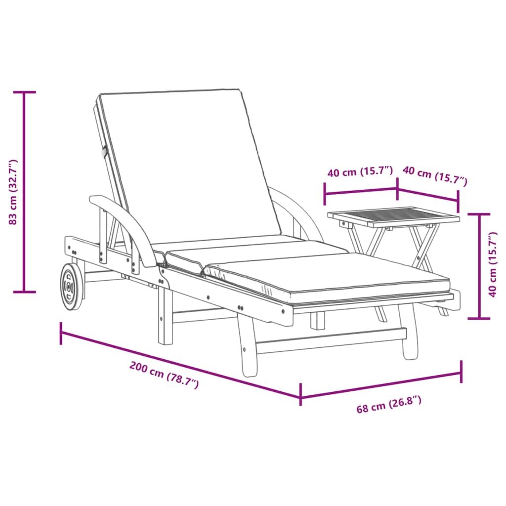 Relax and enjoy the outdoors in this comfortable sun lounger! Robust and stable: Solid acacia wood is known for its strength and durability. Its diverse colours and unique grain patterns give it an attractive appearance. With good stability and resistance to weathering, it is ideal for crafting indoor and outdoor furniture.Manual reclining function: This reclining chair is specially designed with 5 reclining positions so that you can adjust the backrest and footrest manually as per your comfort.Comfortable seat experience: This outdoor furniture, complete with thickly padded cushions, offers a comfortable seating experience.Convenient pull-out table: This outdoor furniture features a convenient pull-out table, providing a convenient spot to keep your essentials within easy reach.Well-ventilated and pooling prevention: The slatted design promotes optimal airflow and effectively prevents water pooling, ensuring a dry and comfortable seat.Removable and washable cover: These seat cushions feature removable covers for easy washing and maintenance.Foldable design: The table can be easily folded away when not in use, for easy storage and transportation.Easy movement: You can move the outdoor lounger around easily, thanks to its lightweight design and wheels. Good to know:To make sure your outdoor furniture stays beautiful, we recommend protecting it with a waterproof cover.