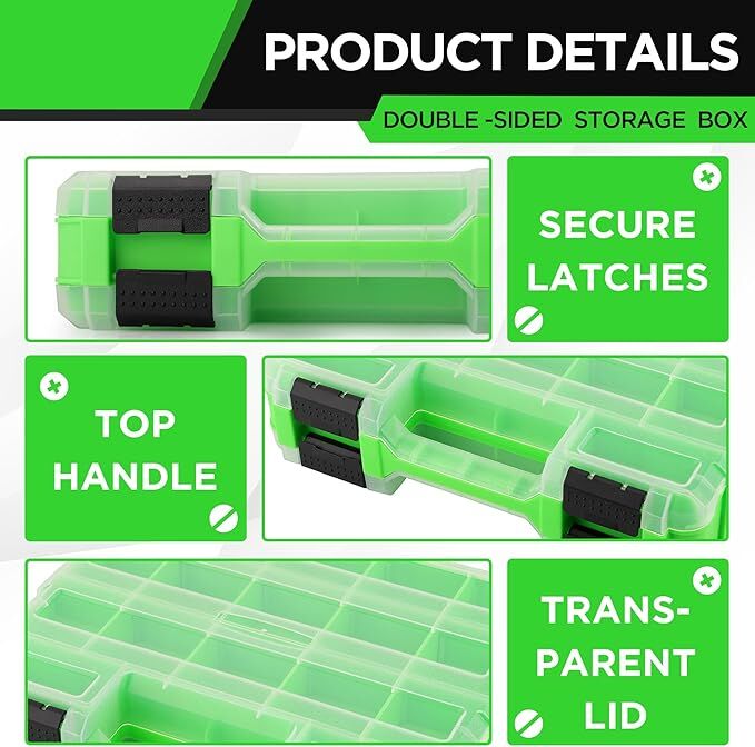 • Double Side Tools Box is suitable for garage storage options, declutter a storage cabinet, carry fishing lures, or small parts, fasteners, screws, nuts, bolts, beads, jewelry and more.