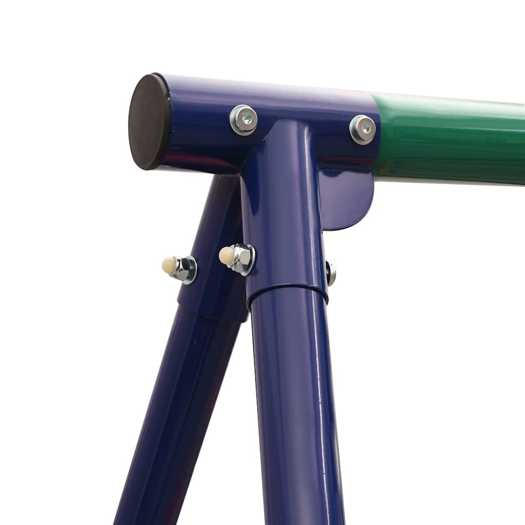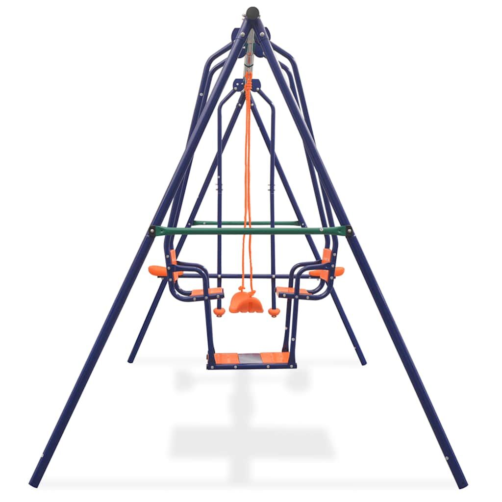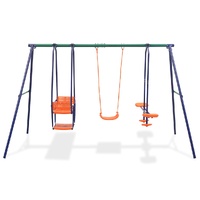 Playing on this swing set will become your children's favourite outdoor activity! Up to 5 kids can play simultaneously while enjoying a fresh breeze or a sunny day. This swing set consists of a sturdy metal A-frame with a single swing, a face-to-face swing and a tandem swing seat. The face-to-face swing and the tandem seat are suitable for two children at the same time. Thanks to its sturdy steel frame and plastic seats, the set is extremely durable and weather resistant, while it is also easy to assemble. All swings are securely fixed to the sturdy A-frame crossbar sturdy brackets, bolts, hooks and ropes. The ground pins and all the necessary installation accessories are included.