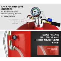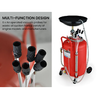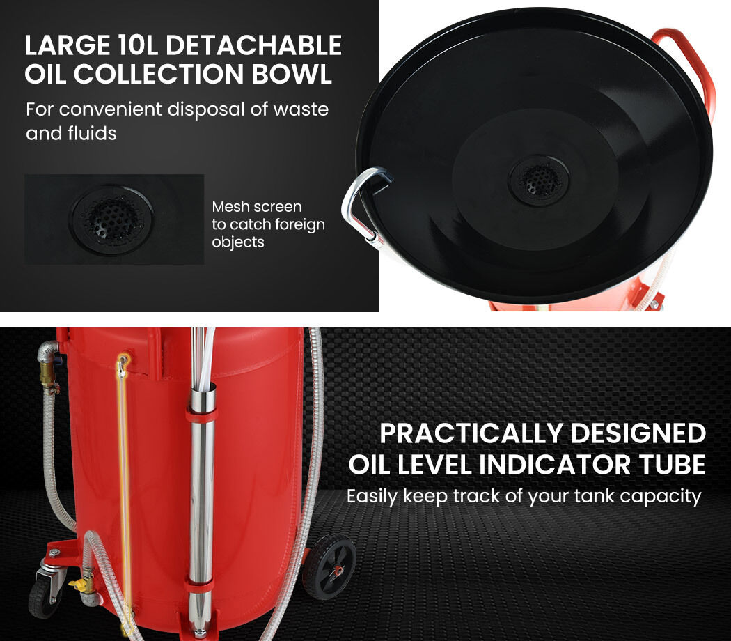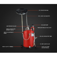Its multifunction design allows for traditional gravity assisted waste oil extraction, or you can connect an air compressor for fast pneumatic vacuum suction directly from a vehicle transmission via a dipstick tube. It comes equipped with 6 different sized dipstick tubes for waste oil suction, in order to suit almost every engine model and manufacturer!