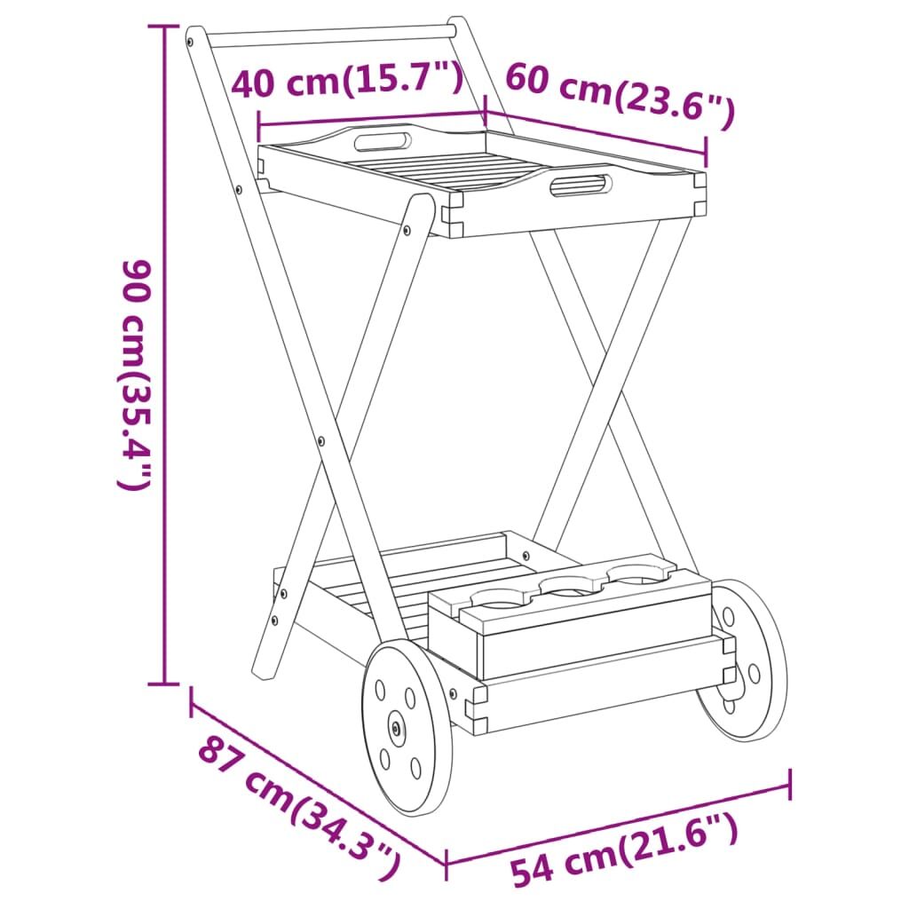 The tea trolley is a great choice for helping you transfer dishes or serve food and beverages easily. Durable material: Solid acacia wood is a beautiful natural material. Acacia wood is a tropical hardwood, which is dense, sturdy, and durable.Practical castors: The wooden tea trolley has 2 smooth castors, which can move around effortlessly.Ample storage space: Featuring 2 tiers, the tea trolley on wheels provides sufficient space to store your dishes, cups, and other essential items.Utility holder: Thanks to the included holder, you can move around up to 3 bottles at once for serving. Good to know:To make assembly as easy as possible, each product is delivered with a manual. Note:To make sure your outdoor furniture stays beautiful, we recommend protecting it with a waterproof cover.