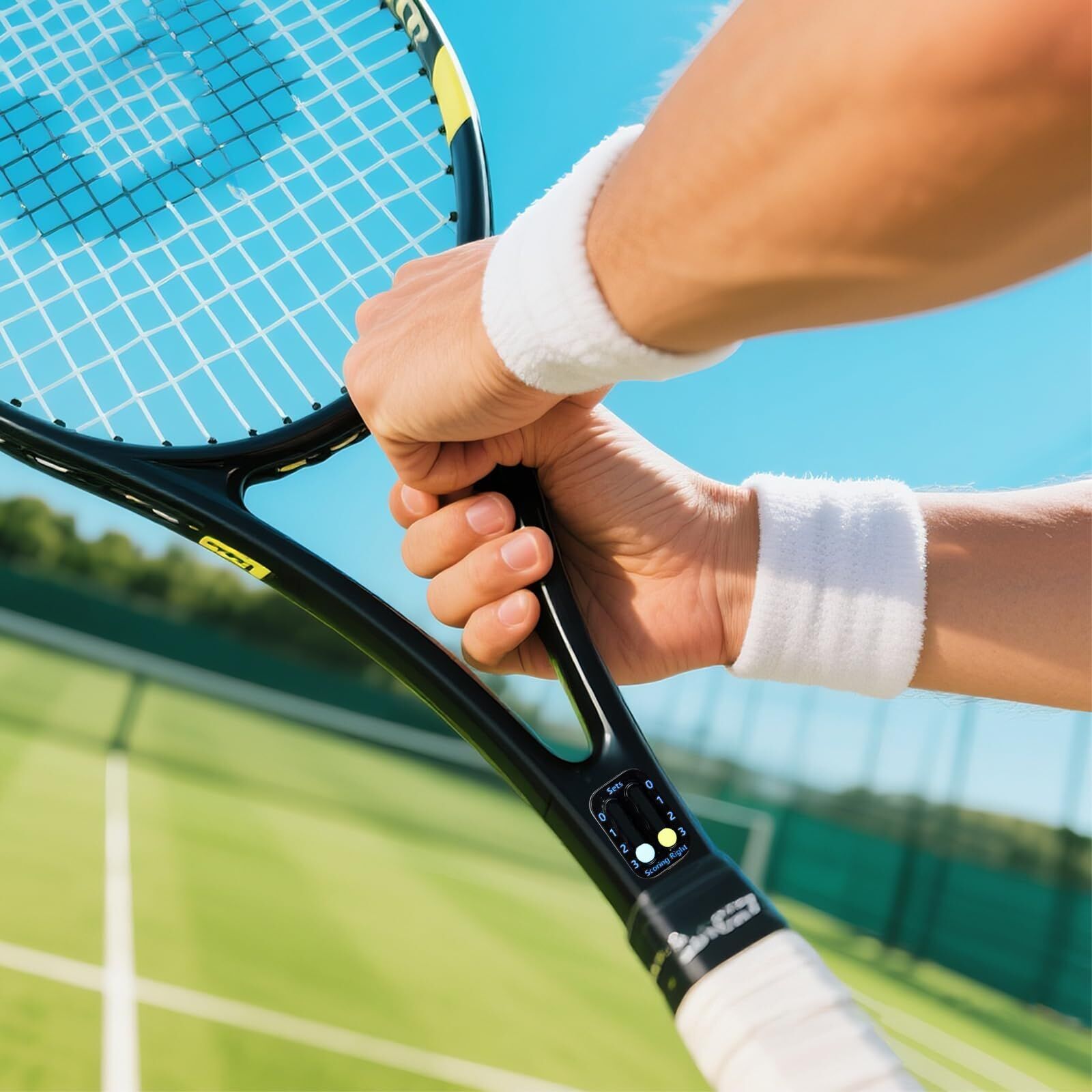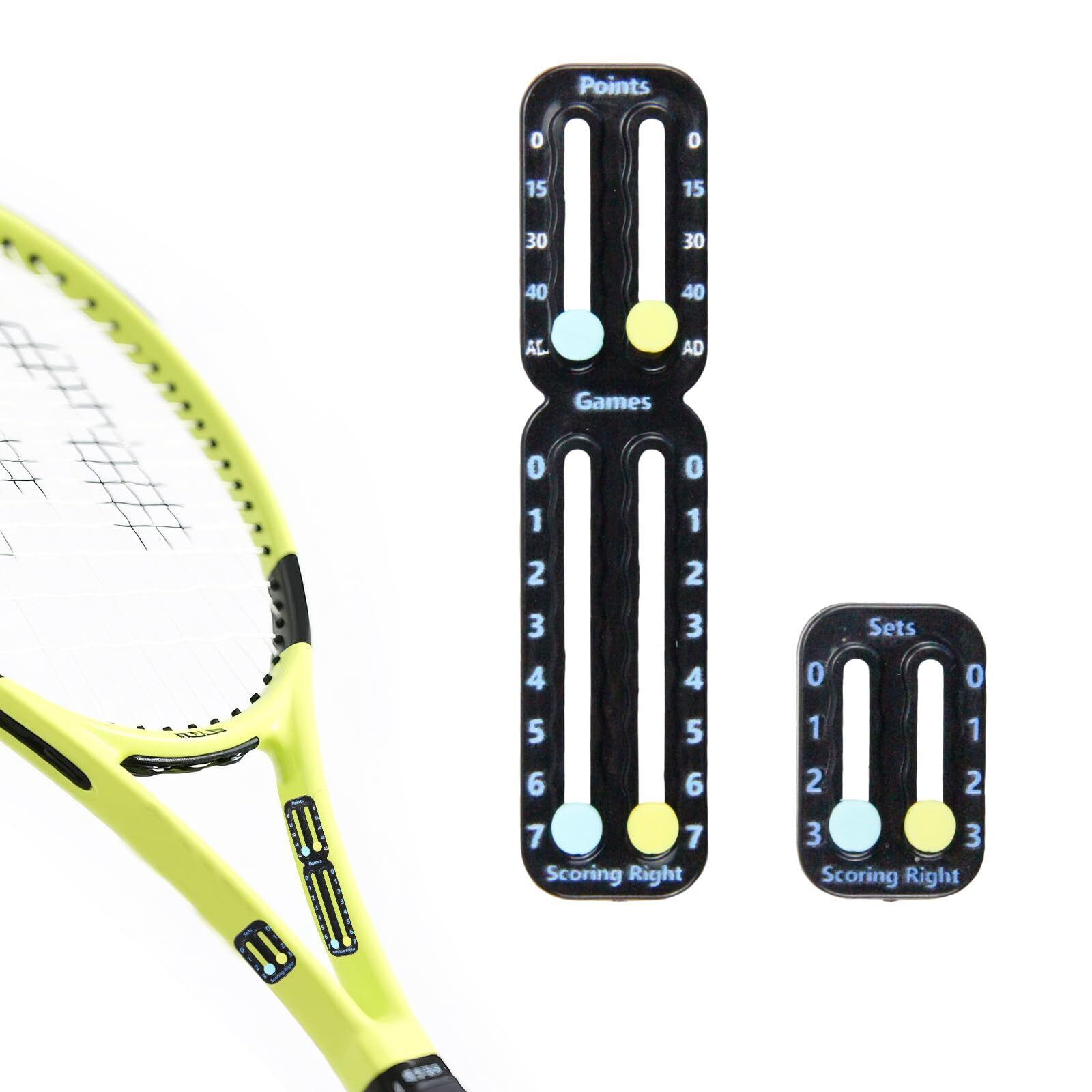 Elevate your tennis game with this compact and reliable portable racket scorekeeper, designed to keep track of points, games, and sets right on your racquet. Whether you're a beginner learning the rules or a competitive player fine-tuning strategy, this lightweight scoreboard ensures you never lose sight of the score during intense rallies. Made from durable, high-quality plastic, it features a clear layout with color-coded sliding markers for easy visibilityblue and yellow beads move smoothly along tracks labeled for points (040, AD), games (07), and sets (03). The slim profile fits seamlessly on any standard tennis racquet throat, inside or outside, without affecting balance or swing weight. With strong adhesive backing that dries fast and holds firmly through powerful swings and outdoor conditions, it stays securely in place even during long matches. Perfect for training sessions, casual play, or official competitions, this ITF-approved accessory is both functional and stylish. A must-have gift for tennis lovers at every level.