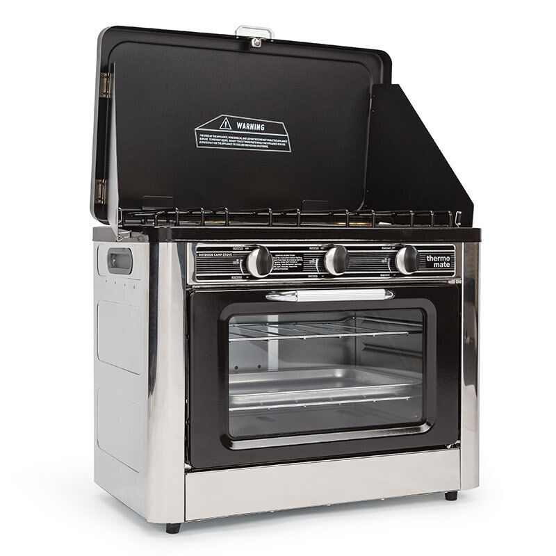 With the portable Thermomate Outdoor Camping Oven and Stove you can enjoy all the cooking capabilities you have at home wherever you are! Thermomate make it easy to cook delicious and healthy meals during your vacation, just connect the Camping Oven and Stove to an LPG gas bottle and bring out your inner chef!Designed for independent or concurrent use, the two brass stove burners and camping oven are ready to create the meals you crave. The versatile Thermomate 2-IN-1 Oven and Stove allows you to cook outdoors with ease. Imagine yourself waking up to a full Aussie breakfast of bacon, fried eggs, baked beans and freshly baked bread, or enjoying a cup of your favourite coffee while your lasagna is cooking to perfection for your evening meal. Whether you’re camping by the beach, in the outback or on the snowy mountains, you can now enjoy the taste of a home-cooked meal in the great outdoors.Made with quality stainless steel, you can be confident of the unit's durability. Featuring 5,300 BTU twin stove burners with non-stick enamel surface, a 3500 BTU oven with dual racks, removable oven thermometer and a bonus roasting tray, the Thermomate Outdoor Camping Oven has thoughtfully included everything you need to create a home cooked meal outdoors. The folding lid and arms will shelter heat from wind while cooking. Cleverly designed, it is powerful yet compact, weighing only 15kg, ensuring easy transportation and storage.Don't delay, buy your Thermomate Outdoor Camping Oven and Stove today and experience endless cooking possibilities in the great Australian outdoors!