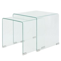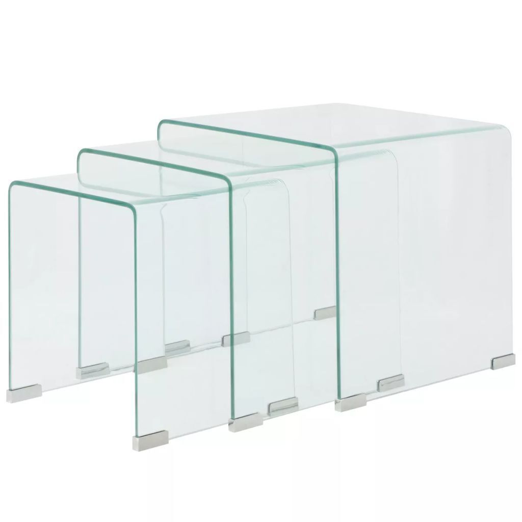 $228.41This 3-piece nesting table set is the perfect alternative for small flats or wherever space is a bit limited. Its contemporary design makes this nesting table set a chic addition to your living room or bedroom. The nesting tables are multifunctional. They can be used in the living room as a convenient surface to rest your drinks or any other necessities you need close at hand. You can also bring one of them into your bedroom for use as a unique nightstand! The nesting tables are made of tempered safety glass. Thanks to the tables' difference in size, this nesting coffee table set can not only meet your multiple needs, but also provides extra space and easy storage when the smaller tables are hidden under the bigger one. Delivery includes three nesting tables.