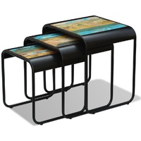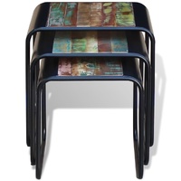 This vintage-style set of 3 wooden nesting tables, made of solid reclaimed wood, will make a timeless addition to your home. These tables can be used as coffee tables, couch tables, living room tables, side tables, nightstands, telephone stands, etc. Thanks to the strong steel frame, the tables are very steady and durable. Being stackable, these tables save a lot of space when not in use. The tables are made of recycled wood, which means every piece of furniture is unique and slightly different from the next. Furniture made of reclaimed wood has the characteristics of different woods, like teakwood, acacia, mango wood, saal wood, etc. Reclaimed wood is solid, stable, durable, and beautiful. Signs of wear and visible grain structure give each piece its own history and unique look. The table set is fully handmade, and the craftsmanship adds to its spectacular retro style. Every step of the process is carried out with the greatest care, be it recombining, polishing, painting or waxing. Important note: Colours vary from piece to piece, making each of our tables unique. The delivery is random, ensuring the exclusivity and individuality of your product.