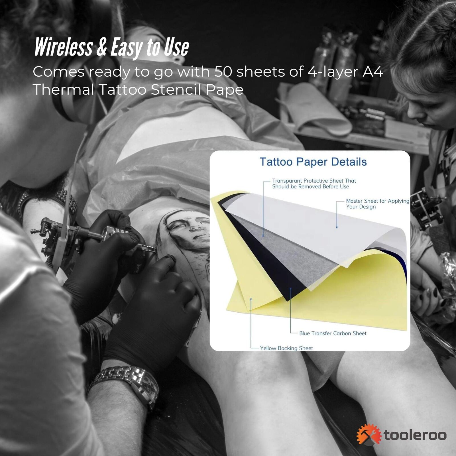 Tooleroo Portable A4 Thermal Printer and Tattoo Stencil Paper Kit – your ultimate compact, and quick start solution for Professional Tattoo Design Transfer! With effortless wireless bluetooth connectivity and a sleek, lightweight design, this portable printer makes stencil printing easy, anytime, anywhere. Perfect for those who need fast and convenient printing without the hassle! Comes ready to go with 50 sheets of 4-layer A4 Thermal Tattoo Stencil Paper!