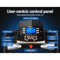 $713.45Compact and sturdy with its powder-coated steel frame, the Everfit Electric Treadmill allows you to perform essential cardio exercises within the comfort of your home. It features 12 pre-set training programs designed to simulate natural terrain. A user-centric control panel with a digital LCD display lets you set up to 18 speed levels and other monitoring parameters. Its linear power drive motor produces smooth and seamless operation and the anti-slip belt and soft-grip handle bar with pulse sensors make your session a comfortable and controlled experience. Other great features include a 15-level inclination adjustment, innovative double shock absorption system, automatic motor and belt lubrication, safety tether key and smooth wheels for easy mobility. Not least, the electric treadmill is also equipped with a USB and MP3 connection, dual speakers, dual drink holders and a tablet holder for those who like to work out in style.