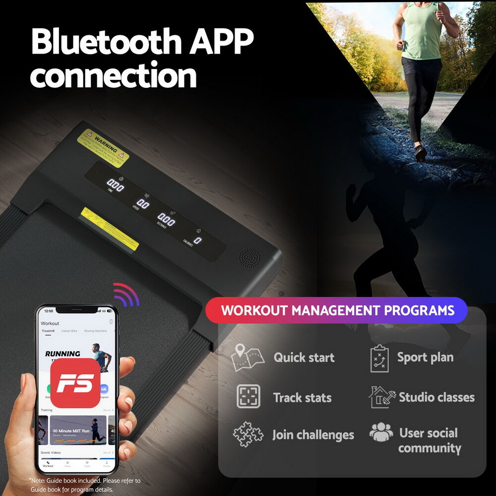 $265.07For a truly effective approach to weight loss and toning, our Everfit Walking Pad is your perfect companion. Compact and sturdy, the walking pad allows you to perform essential cardio exercises within the comfort of your home. It is foldable, easy to move, and comes ready to hit the ground running no assembly required. Controlled by either the companion app or remote control, set up speeds of between 1km/h and 10km/h and monitor speed, time, distance and calories. Its powerful and energy-efficient motor produces smooth and seamless operation and the anti-slip belt phone holder makes your session a comfortable and controlled experience. The 400mm non-slip running belt uses an enhanced shock control system to help reduce the risk of joint injury, making the walking pad suitable for adults and seniors. When all the hard work is done, easily fold the compact walking pad and store away. Other great features include smooth wheels for easy mobility and Bluetooth speakers for entertainment while exercising. For health results that matter, our fitness walking pad is the one to run to.
