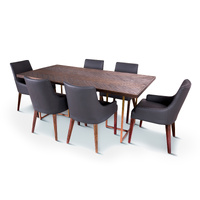 The dining space is the best place to enjoy light moments with the family. Decorate this space with this 7-piece dining set and enjoy such moments in a better way. The multi-colour set is crafted in the modern style. In the set, the dining table is a Tesky colour, while the chairs are dark grey. The 6-seater dining table with strong, metal legs is complemented with beautiful chairs upholstered in soft, PU leather. The legs of the chair are made of Solid acacia timber.The dining table exudes an exceptional look as it is made of sustainably harvested Solid and veneered Acacia timber with a herringbone pattern parquet top showcasing a beautiful pattern of wood. The tabletop showcases the natural appeal of the Acacia grain. Metal legs with a durable powder coat finish and in a unique design further add to the tables beauty. A one-year warranty is included with this easy-to-assemble dining set.