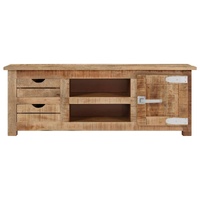 This wooden TV cabinet with a rustic charm is meant to be a true centrepiece of your interior. The sideboard is made of rough mango wood, a tropical hardwood with the strength to bear the weight. It also stands the wear and tear of time, making it stable and durable. The craftsmanship and the beautiful wood grains make every piece of furniture unique and slightly different from the next. Additionally, this hifi cabinet features 2 drawers, 2 compartments and 1 door, providing ample space for storing your multimedia appliances, books, shoes, as well as various other items. Important note: The wood grains vary from piece to piece, making each piece unique. The delivery is random, ensuring the exclusivity and individuality of your product.