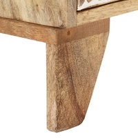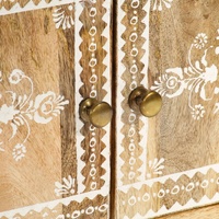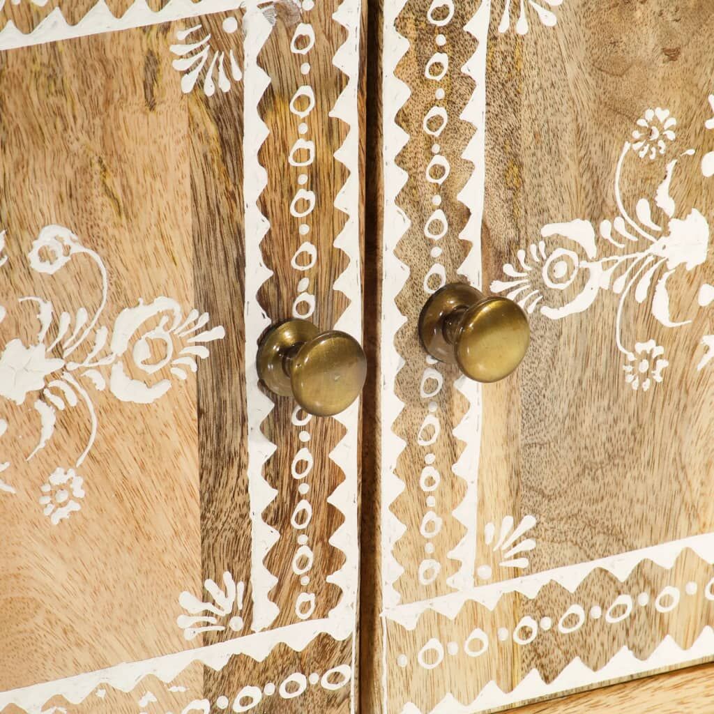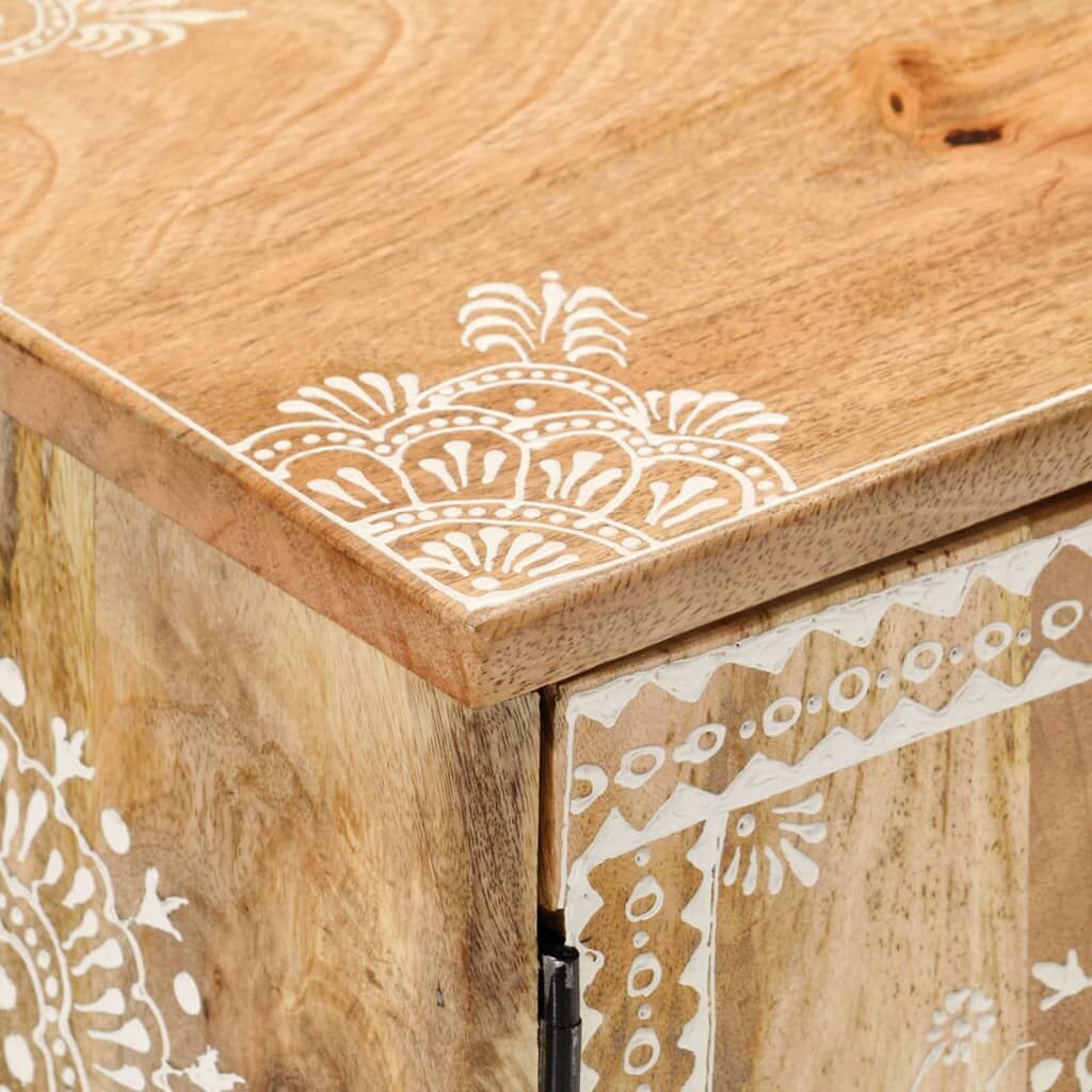 This solid mango wood TV stand is a perfect match for your TV and will keep your media appliances and carriers neatly organised. Solid mango wood: This TV stand is made of solid mango wood, a hardwood with dense grains. Solid mango wood not only has the strength to bear the weight but also stands the wear and tear of time. Spacious storage: The three compartments of this TV unit provide ample spaces for you to keep your DVD player, game console, streaming device and media carriers neatly organised. Gorgeous painting patterns: The handpainted decorative patterns of this media cabinet will add a unique touch of style to your living area. Practical doors: Keep your space clutter-free by hiding small essentials behind the doors of this media unit.Wooden feet: The wooden feet of this HiFi cabinet give the product a natural and pleasant look while ensuring stability. It can blend well with any interior decor. Note:The colours may vary from piece to piece, making each piece unique and slightly different from the next. The delivery is random, ensuring the exclusivity and individuality of your product.Each product comes with an assembly manual in the box for easy assembly.