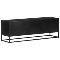 This wooden TV cabinet has an industrial style and makes it a perfect choice for your interior living space. The stereo cabinet is made of rough mango wood, a tropical hardwood with the strength to bear the weight. It also stands the wear and tear of time, making it stable and durable. The powder-coated iron frame also adds extra stability. The media unit also features two doors with hand carved pattern and a compartment providing ample storage space. Additionally, the sturdy top can be used to display decorative objects such as photo frames, potted plants, vases, etc. Important note: Colours and grains vary from piece to piece, making each piece unique. The delivery is random, ensuring the exclusivity and individuality of your product.