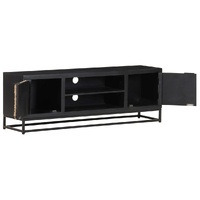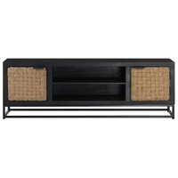 This wooden TV cabinet has an industrial style and makes it a perfect choice for your interior living space. The stereo cabinet is made of solid mango wood, a tropical hardwood with the strength to bear the weight. It also stands the wear and tear of time, making it stable and durable. The door is made of natural jute and the iron base also adds extra stability. The media unit also features two doors and two compartments providing ample storage space. Important note: Colours and grains vary from piece to piece, making each piece unique. The delivery is random, ensuring the exclusivity and individuality of your product.