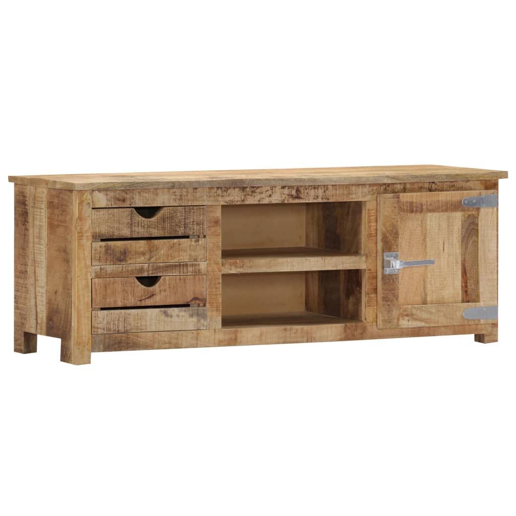 This wooden TV cabinet exudes a rustic charm. It will become a truly centrepiece of your interior. The sideboard is made of solid mango wood, a hardwood with dense grains. Rough mango wood not only has the strength to bear the weight, but also stands the wear and tear of time. Therefore this beautifully-designed lowboard is exceedingly stable, durable and captivating. Additionally, this stereo cabinet is fully handmade and the aesthetically-appealing wood grains make every piece of furniture distinctive and slightly different from each other. This HiFi cabinet features 2 drawers, 2 compartments and 1 cabinet with door, providing ample space for storing your multimedia appliances, books, shoes, as well as various other items. Important note: The wood grains vary from piece to piece, making each piece unique. The delivery is random, ensuring the exclusivity and individuality of your product.