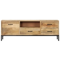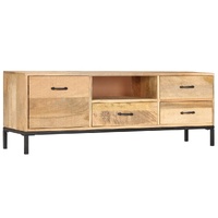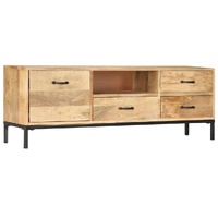 This antique-style wooden TV cabinet exudes a vintage charm and will make a timeless addition to your interior. This HiFi cabinet is made of solid mango wood, which is a hardwood with dense grains. Rough mango wood on the one hand has the strength to bear the weight, on the other hand stand the wear and tear of time. Therefore this beautifully-designed side cabinet is stable, durable and eye-catching. The perfect craftsmanship guarantees that every step of the process is carried out with the greatest care, be it polishing and lacquering. Besides, this sideboard features 1 cabinet with door, 1 compartment and 3 drawers, providing ample space for storing your multimedia appliances, books, and various other items. Important note: The colours and grains vary from piece to piece, making each piece unique. The delivery is random, ensuring the exclusivity and individuality of your product.