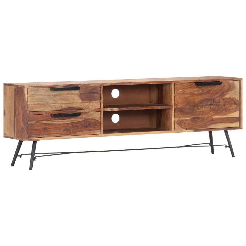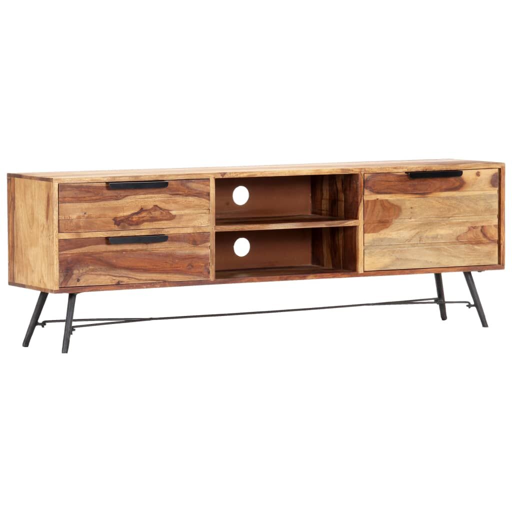 This stylish industrial wooden TV cabinet will make a great decorative addition to your bedroom or living room. This TV cabinet is made of solid sheesham wood. Sheesham is a tropical hardwood which is famous for its rich grains, also known as rosewood or palisander. Additionally, it doesn't warp or split, and has natural decay resistance. It may have some imperfections, which are not intentional but nonetheless add to the cabinet's spectacular industrial and antique style. The shelves and drawers provide ample storage space for your digital receiver, DVD player, gaming console or other multimedia devices and carriers, but also things like books, notepads, pens and other knick-knacks. The visible grain structure makes every piece of furniture unique and slightly different from the next. It is easy to assemble. Important note: The colours vary from piece to piece, making each piece unique. The delivery is random, ensuring the exclusivity and individuality of your product.