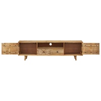 This wooden TV cabinet will make an eye-catching addition to your interior. The HiFi cabinet is made of solid mango wood, which is a hardwood with dense grains. Rough mango wood not only has the strength to bear the weight, but also stands the wear and tear of time. Therefore this beautifully-designed cabinet is stable, durable and eye-catching. This stereo cabinet is fully handmade and the aesthetically-appealing wood grains make every piece of furniture distinctive and slightly different from each other. This lowboard features 2 drawers, 1 compartment and 2 cabinets with doors, providing ample space for storing your multimedia appliances, books, as well as various other items. Important note: The colours vary from piece to piece, making each piece unique. The delivery is random, ensuring the exclusivity and individuality of your product.