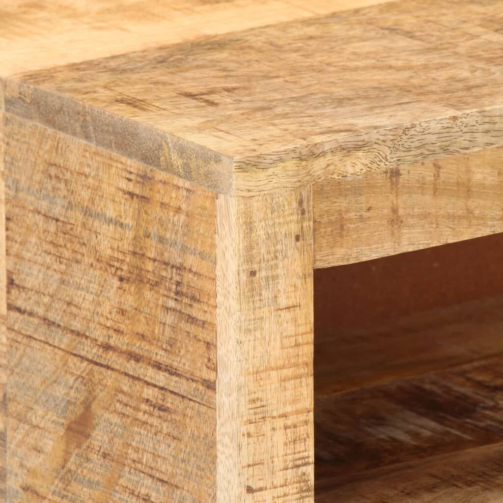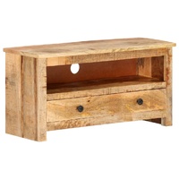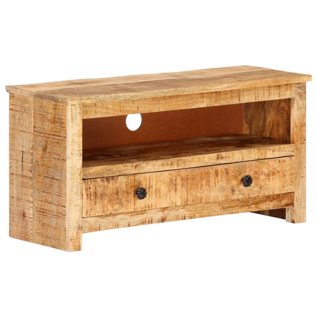 The wooden TV cabinet adds a vintage style to your bedroom and living room! The stereo cabinet is made of solid rough mango wood, a tropical hardwood with the strength to bear the weight. It also stands the wear and tear of time, making it stable and durable. The craftsmanship and the beautiful wood grains make every piece of furniture unique and slightly different from the next. This media unit also features a drawer and a compartment, providing ample storage space for keeping your essential items organised and within reach. Important note: Colours and grains vary from piece to piece, making each piece unique. The delivery is random, ensuring the exclusivity and individuality of your product.