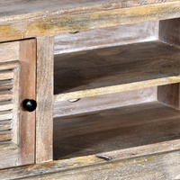 This rustic wooden TV cabinet is the way to go if you are looking to add some vintage style to your home decor. The side cabinet is made of mango wood which is solid, stable, durable and beautiful, and the craftsmanship adds to its spectacular retro style. The mango wood has been treated in a distinctive style to make it more wear resistant while still allowing it to keep its natural charm. This TV stand has 2 cabinets and 2 shelves that will be ideal for keeping your DVD player, game console, streaming device and media carriers neatly organised. The Hi-Fi cabinet can also be used as a side cabinet, low board, sideboard, etc. Note: The item is already assembled; no assembly is required. Colours and grain patterns may vary from piece to piece, making each of our TV cabinets unique. The delivery is random, ensuring the exclusivity and individuality of your product.