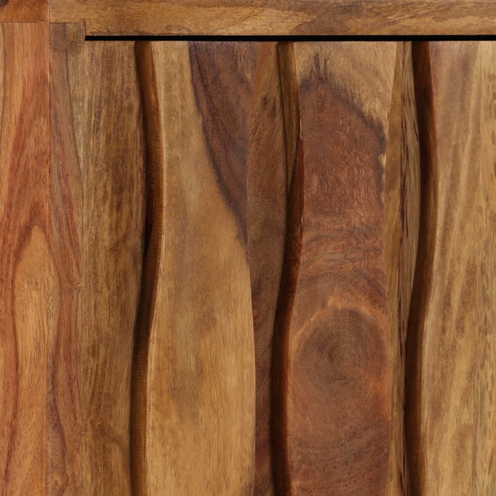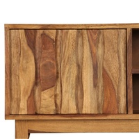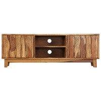 Our wooden TV cabinet will make a timeless addition to your living room or entertainment area decor. Crafted from solid Sheesham wood, this TV stand is durable and stable. Sheesham is a tropical hardwood that is famous for its rich grains and also known as rosewood or palisander. This TV stand with 2 cabinets and 2 shelves provides ample space for keeping your DVD players, game consoles, streaming devices, media carriers, etc. neatly organised. The beautiful grains on the cabinet's doors make this lowboard more attractive and add to its rustic style. Every step of the construction process is carried out with the greatest care, be it polishing, painting or lacquering. Assembly is easy. Important note: The colours and grains vary from piece to piece, making each piece unique and slightly different from the next. The delivery is random, ensuring the exclusivity and individuality of your product.