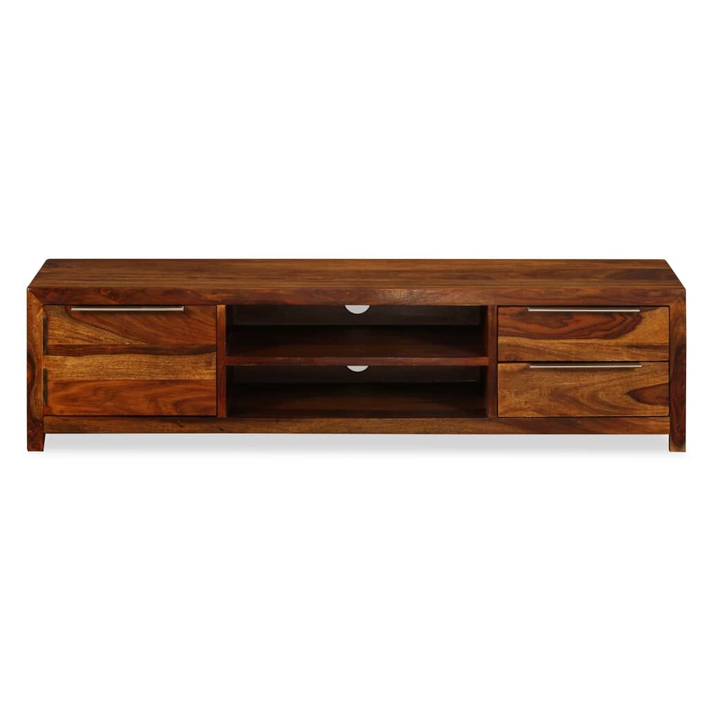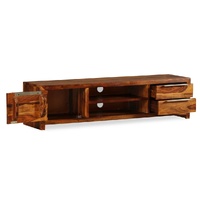 This wooden TV cabinet is both stylish and practical, and will be make a great addition to your living space. It can also be used as a sideboard, low board, etc. The hi-fi cabinet has two shelves, two drawers and one cabinet with a door, which will be ideal for keeping your DVD player, game console, streaming device and media carriers neatly organised. This sheesham TV cabinet is made of solid wood. Sheesham is a tropical hardwood that is famous for its rich grains and also known as rosewood or palisander. The craftsmanship and beautiful wood grains make every piece of furniture unique and slightly different from the next. Assembly is very easy. Important note: Colours vary from piece to piece, making each of our TV cabinets unique. The delivery is random, ensuring the exclusivity and individuality of your product.