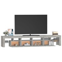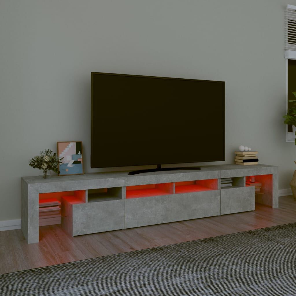 Featuring a trendy yet practical design, this TV cabinet with LED lights definitely becomes a focal point of your room. Practical material: The engineered wood is of exceptional quality with smooth surface and also features strength, stability and resistance to moisture. Colourful LED lights: The TV stand features RGB LED lights, which has different menus to change the colour of lights and let the colour adjust automatically differently. The LED lights underline the modern look and contribute to the trendy feeling.Ample storage space: The TV unit provides plenty of storage space for keeping your magazines, books, remote controls and other small items well-organised and within easy reach.Displaying function: The sturdy top of media cabinet is ideal for displaying decorative objects, photo frames, or potted plants. Note:The product has a USB connector, but the certified 5V USB power source is not included.Each product comes with an assembly manual in the box for easy assembly.
